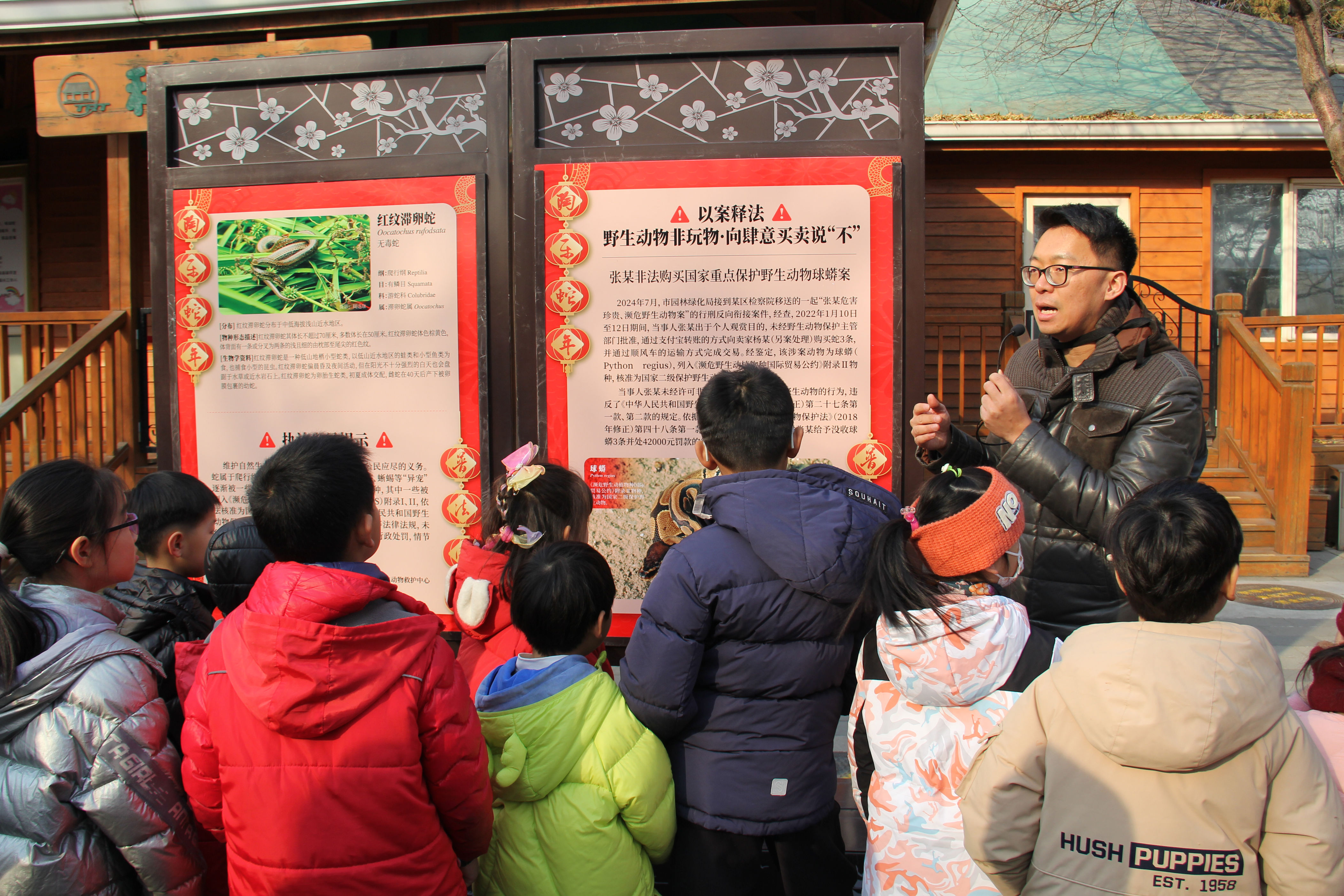 1月23日,北京市园林绿化局执法处工作人员以案释法,向公园游客介绍非法猎捕、交易、饲养、运输“异宠”行为的违法风险。北京市园林绿化局执法处供图